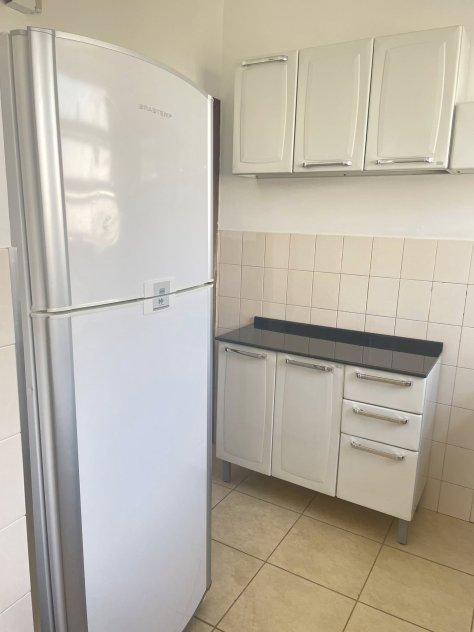 Cozinha com armários, fogão, micro-ondas, geladeira