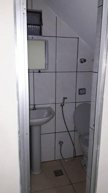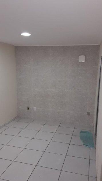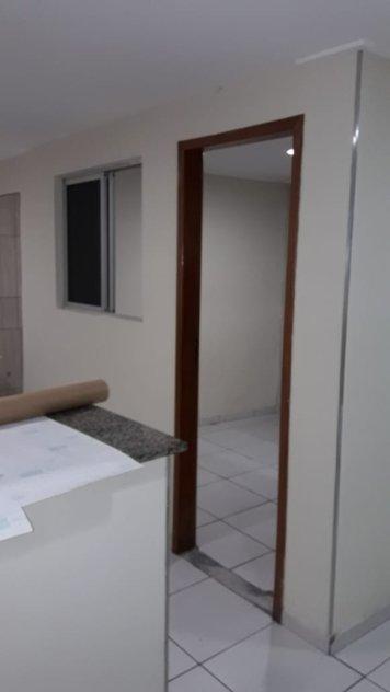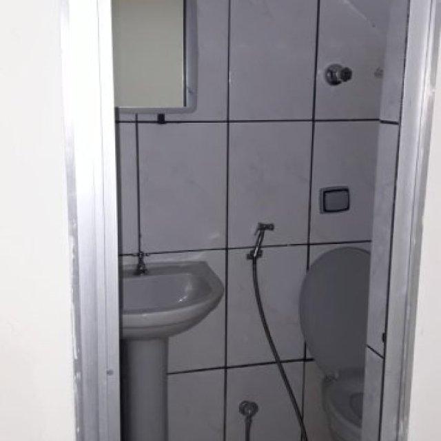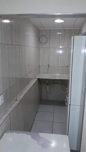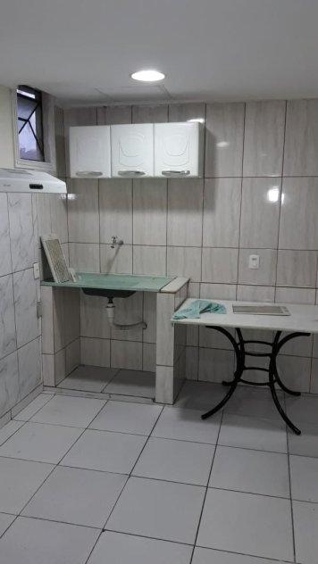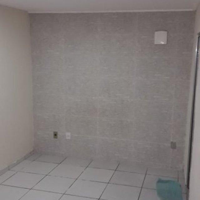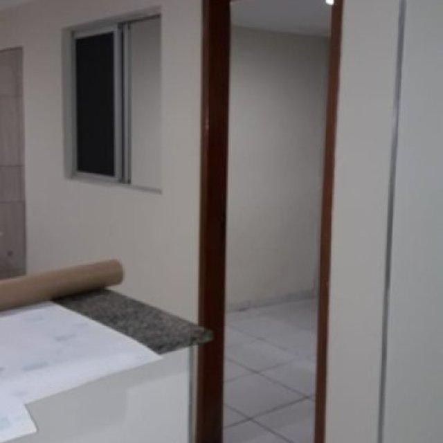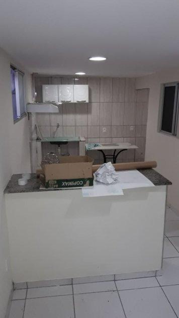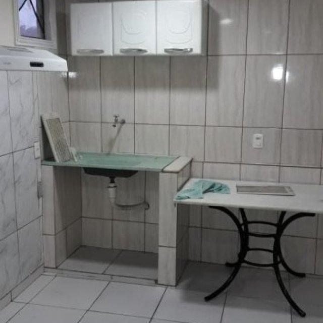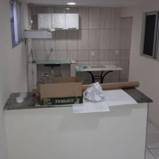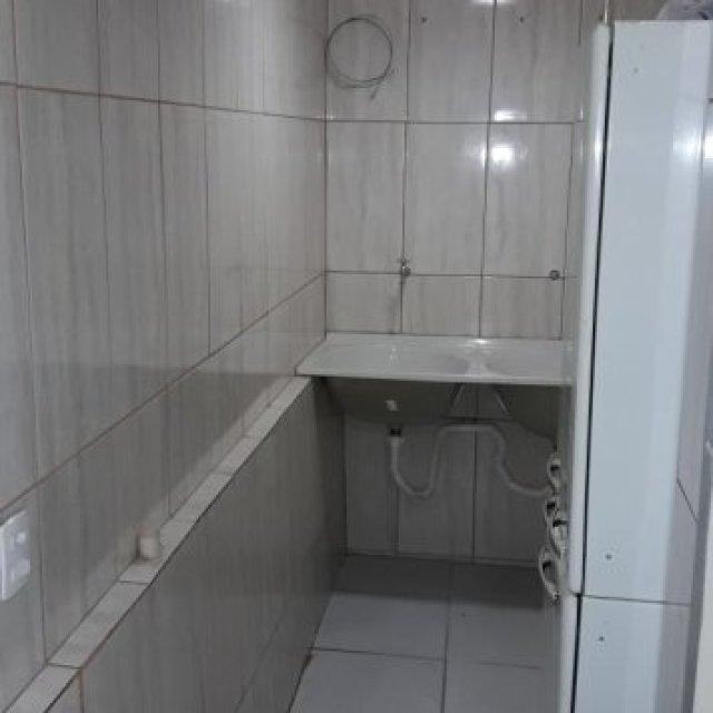 Kitnet estilo apartamento, quarto, sala, cozinha conjugada, banheiro e lavanderia.